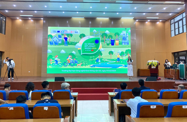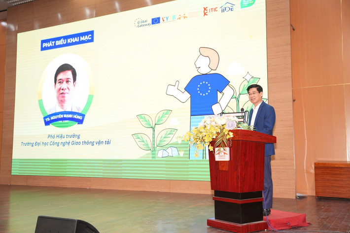 Phát biểu khai mạc, TS. Nguyễn Mạnh Hùng - Phó Hiệu trưởng cho rằng, biến đổi khí hậu là vấn đề cấp bách nhất trong thời đại ngày nay, do đó các Chính phủ, chính quyền thành phố và các công ty đang từng ngày đặt ra các mục tiêu về “Net Zero”, cam kết giảm lượng khí thải Carbon này thể hiện trách nhiệm môi trường và sự cam kết của lãnh đạo thực hiện cam kết quốc tế và các mục tiêu quốc gia về ứng phó biến đổi khí hậu. Với chủ đề "Hướng tới lực lượng lao động xanh vì tương lai bền vững", chúng ta không chỉ hướng tới việc nâng cao nhận thức về bảo vệ môi trường, mà còn khuyến khích sự tham gia tích cực của các bạn trẻ trong việc tạo ra một tương lai xanh và bền vững. Trường Đại học Công nghệ Giao thông vận tải luôn chú trọng việc đào tạo một thế hệ trẻ sinh viên không chỉ có kiến thức vững vàng về các lĩnh vực chuyên môn, mà còn hiểu rõ và tham gia vào các hoạt động bảo vệ môi trường xanh. Với sự tham gia của các chuyên gia và tổ chức quốc tế, sự kiện này là cơ hội tuyệt vời giúo Nhà trường tiếp cận với các thông tin, kinh nghiệm và cơ hội nghề nghiệp trong các ngành nghề xanh phát triển bền vững. Sự kiện hôm nay rất ý nghĩa và thiết thực với Nhà trường, ngành GTVT và quốc gia góp phần thực hiện Quyết định số 876/QĐ-TTg ngày 22/7/2022 của Thủ tướng Chính phủ trong Chương trình hành động về chuyển đổi năng lượng xanh, giảm phát thải khí các - bon và khí mê-tan của ngành GTVT. Thời gian tới, Nhà trường cam kết sẽ tiếp tục nỗ lực đào tạo nguồn nhân lực chất lượng cao, tìm các giải pháp về công nghệ và môi trường xanh, bền vững, cũng như luôn sẵn sàng đón nhận để đồng hành hiệu quả các hoạt động, dự án Xanh của Phái đoàn Liên minh châu Âu tại (EU) và Ban cố vấn Thanh niên kết nối tại Việt Nam.