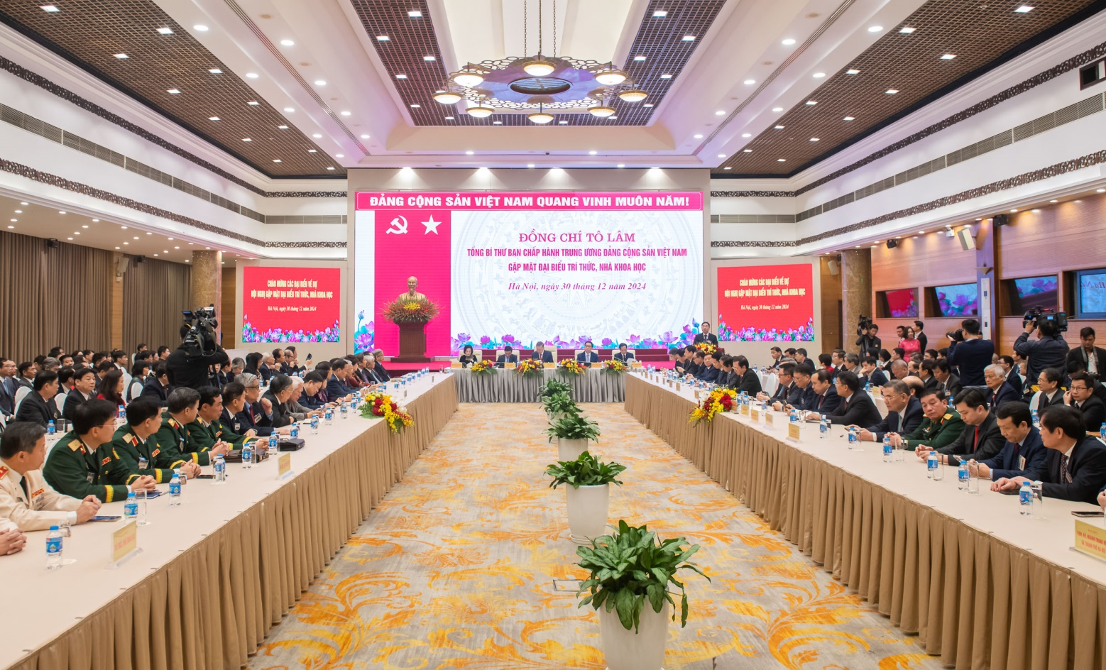 Phát biểu chỉ đạo Hội nghị, thay mặt lãnh đạo Đảng, Nhà nước, Tổng Bí thư Tô Lâm bày tỏ vui mừng gặp các trí thức, nhà khoa học tiêu biểu đại diện cho đội ngũ trí thức, khoa học nước nhà; chúc các đồng chí luôn luôn dồi dào sức khoẻ, hoàn thành xuất sắc trách nhiệm vẻ vang và sứ mệnh cao cả góp phần nâng tầm trí tuệ dân tộc, sức mạnh đất nước, sự phát triển, tiến bộ và văn minh nhân loại. Tổng Bí thư Tô Lâm khẳng định, thế giới đang trong giai đoạn thay đổi có tính thời đại. Sự phát triển mạnh mẽ của khoa học - công nghệ tạo ra sự bùng nổ về thông tin, văn hoá, nhận thức, hành động... thúc đẩy hình thành một trật tự thế giới mới. Với thế và lực của đất nước sau 40 năm đổi mới, với thời cơ, vận hội mới, Đảng, Nhà nước, Nhân dân đang kỳ vọng, mong chờ sự cống hiến, đóng góp ở quy mô, tầm mức mới, với những bứt phá mạnh mẽ của đội ngũ trí thức, nhà khoa học. Chỉ có khoa học công nghệ, đổi mới sáng tạo mới là con đường giúp chúng ta bắt kịp, tiến cùng, bứt phá và vượt lên chính chúng ta và thế giới. Để đạt được yêu cầu này, Tổng Bí thư Tô Lâm đề nghị 04 nội dung: