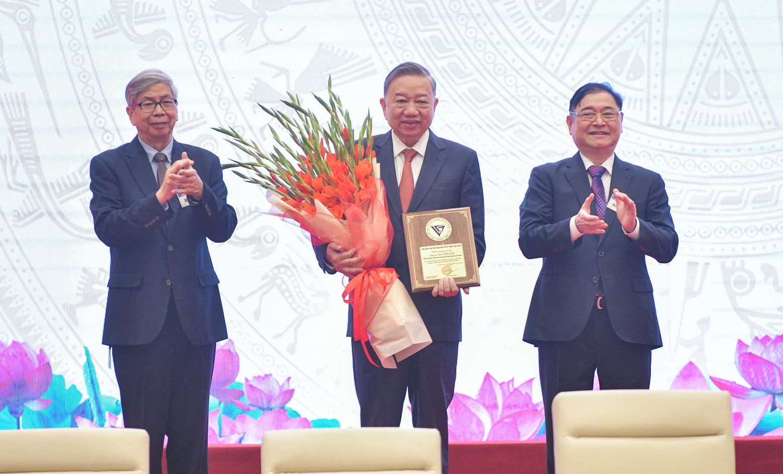 Lãnh đạo Liên hiệp các Hội Khoa học và Kỹ thuật Việt Nam tặng hoa và biểu trưng cho Giáo sư, Tiến sĩ, Tổng Bí thư Tô Lâm