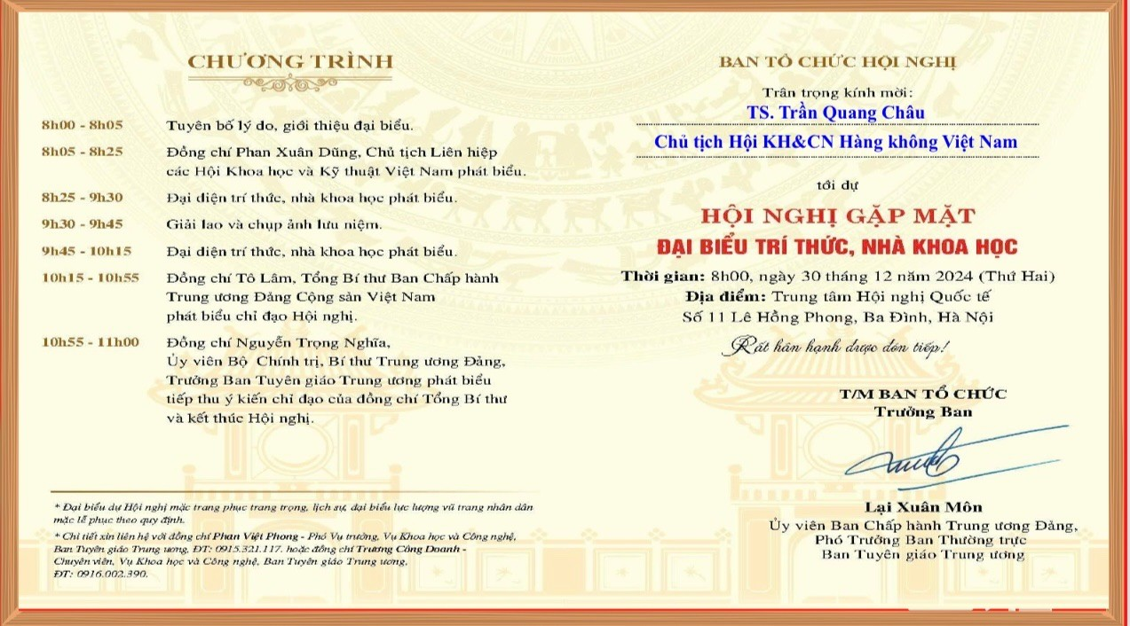 Dự Hội nghị còn có các đồng chí: Ủy viên Bộ Chính trị, Bí thư Trung ương Đảng, Trưởng Ban Tổ chức Trung ương Lê Minh Hưng; Ủy viên Bộ Chính trị, Chủ tịch Hội đồng Lý luận Trung ương, Giám đốc Học viện Chính trị Quốc gia Hồ Chí Minh Nguyễn Xuân Thắng; Bí thư Trung ương Đảng, Chánh Văn phòng Trung ương Đảng Nguyễn Duy Ngọc; Bí thư Trung ương Đảng, Trưởng Ban Đối ngoại Trung ương Lê Hoài Trung. Hội nghị còn có sự tham gia của 200 đại biểu trí thức, nhà khoa học có nhiều đóng góp cho đất nước. Hội Khoa học và Công nghệ Hàng không Việt Nam (VAAST) vinh dự có TS. Trần Quang Châu - Chủ tịch VAAST tham dự Đại biểu cùng phái đoàn tri thức tiêu biểu của Liên Hiệp hội Việt Nam