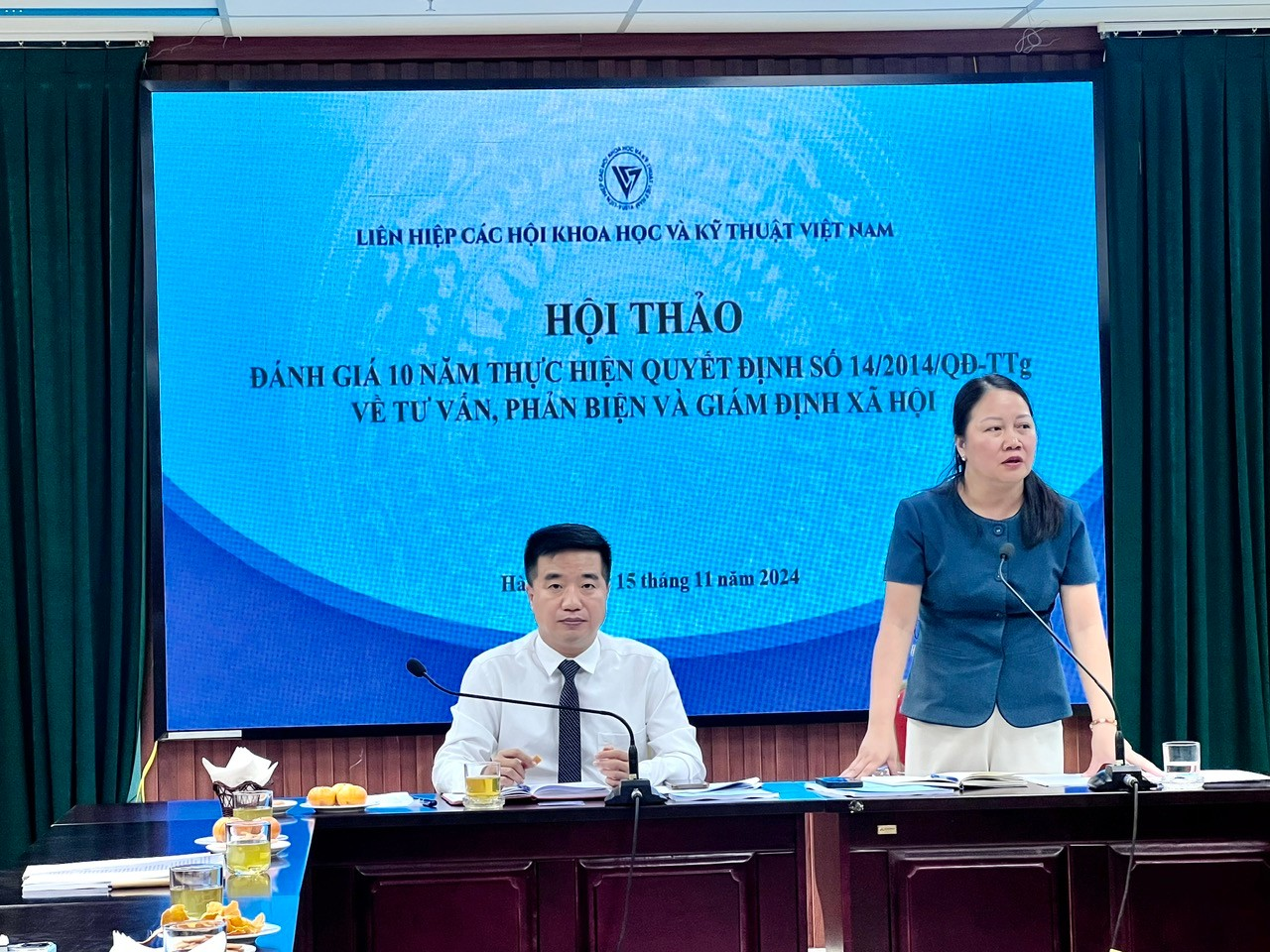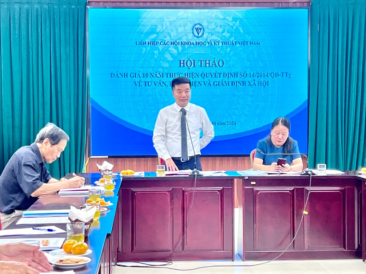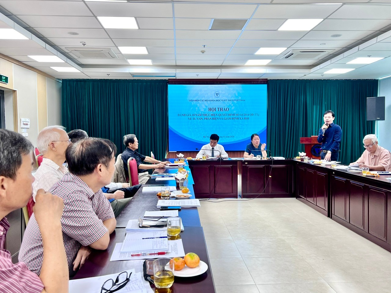 Báo cáo kết quả hoạt động TVPB&GĐXH tại Hội thảo sau 10 năm thực hiện Quyết định số 14/2014/QĐ-TTg của Thủ tướng Chính phủ, Ông Lê Như Quân - Phó Trưởng Ban TVPB&GĐXH trình bày một số kết quả hoạt động sơ kết 05 năm và dữ liệu tổng kết 10 năm thực hiện Quyết định số 14. Rà soát sơ bộ số liệu từ các báo cáo của Hội ngành toàn quốc và các Liên hiệp Hội địa phương gửi báo cáo về VUSTA thông qua đầu mối Ban TVPB&GĐXH chưa thực sự đầy đủ. Do vậy, trong thời gian tới VUSTA tiếp tục tiếp nhận báo cáo của một số Hội ngành còn lại để đưa ra số liệu tổng hợp, phân tích đánh giá được sát thực hơn khi hoàn thiện Báo cáo trình các cấp có thẩm quyền cũng như cung cấp đến cộng đồng bức tranh toàn cảnh về hoạt động TVPB&GĐXH trong 10 năm qua để kịp thời phát huy thành quả đã đạt được và khắc phục, tìm giải pháp giúp tối ưu hóa hoạt động TVPB&GĐXH trong tình hình mới.