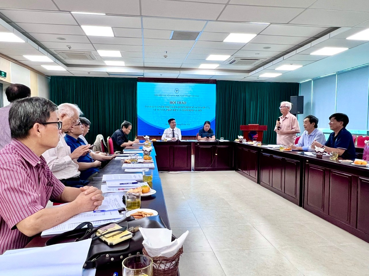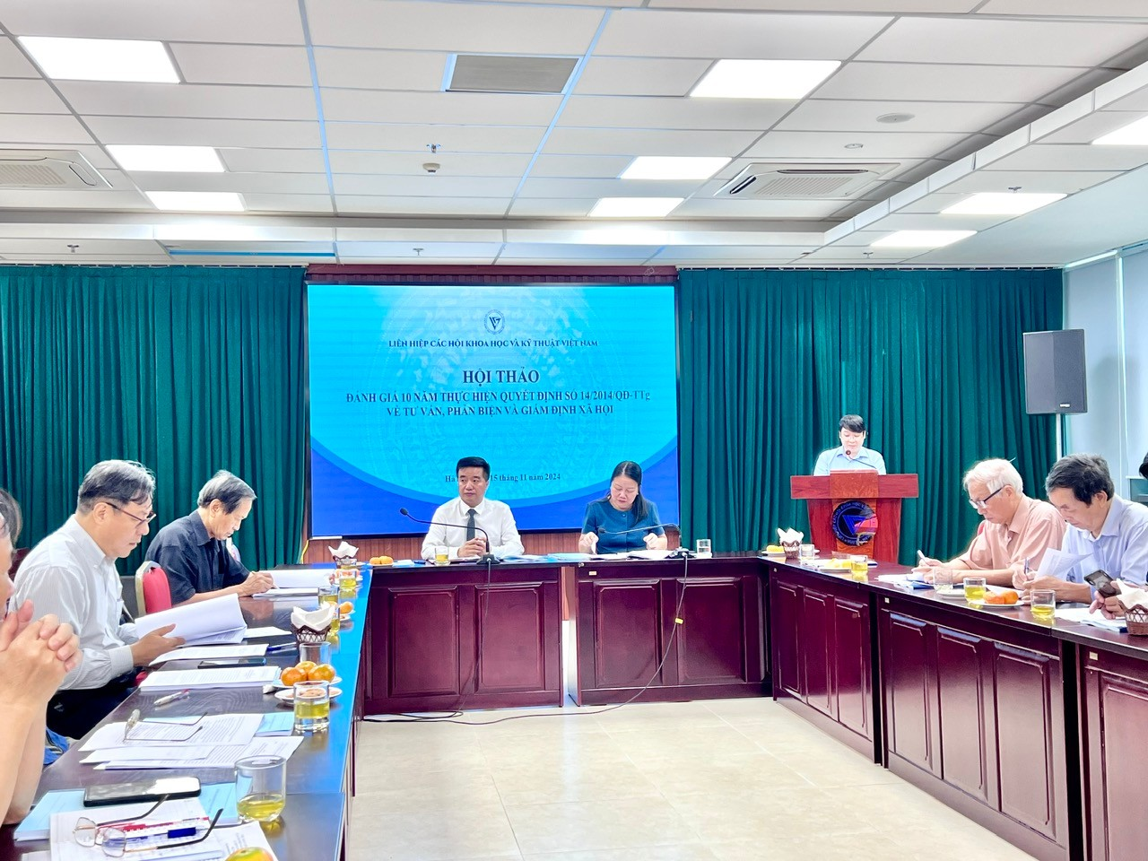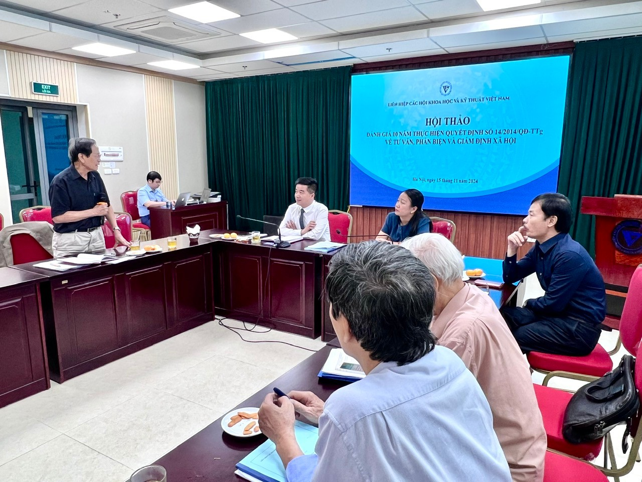 Báo cáo kết quả hoạt động TVPB&GĐXH tại Hội thảo sau 10 năm thực hiện Quyết định số 14/2014/QĐ-TTg của Thủ tướng Chính phủ, Ông Lê Như Quân - Phó Trưởng Ban TVPB&GĐXH trình bày một số kết quả hoạt động sơ kết 05 năm và dữ liệu tổng kết 10 năm thực hiện Quyết định số 14. Rà soát sơ bộ số liệu từ các báo cáo của Hội ngành toàn quốc và các Liên hiệp Hội địa phương gửi báo cáo về VUSTA thông qua đầu mối Ban TVPB&GĐXH chưa thực sự đầy đủ. Do vậy, trong thời gian tới VUSTA tiếp tục tiếp nhận báo cáo của một số Hội ngành còn lại để đưa ra số liệu tổng hợp, phân tích đánh giá được sát thực hơn khi hoàn thiện Báo cáo trình các cấp có thẩm quyền cũng như cung cấp đến cộng đồng bức tranh toàn cảnh về hoạt động TVPB&GĐXH trong 10 năm qua để kịp thời phát huy thành quả đã đạt được và khắc phục, tìm giải pháp giúp tối ưu hóa hoạt động TVPB&GĐXH trong tình hình mới.