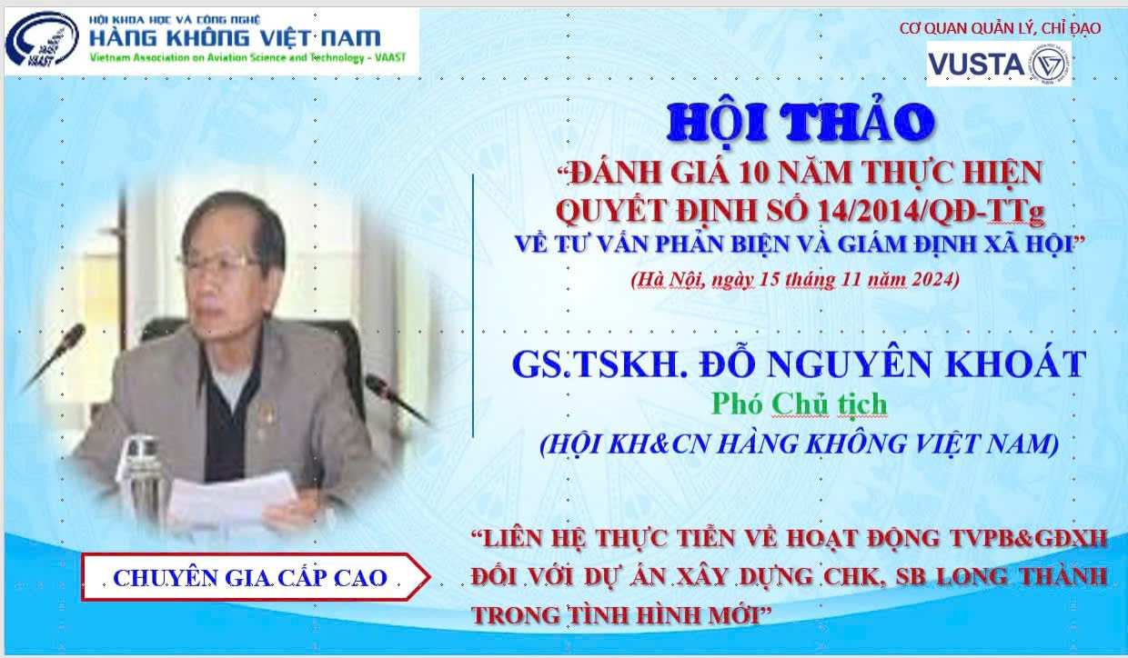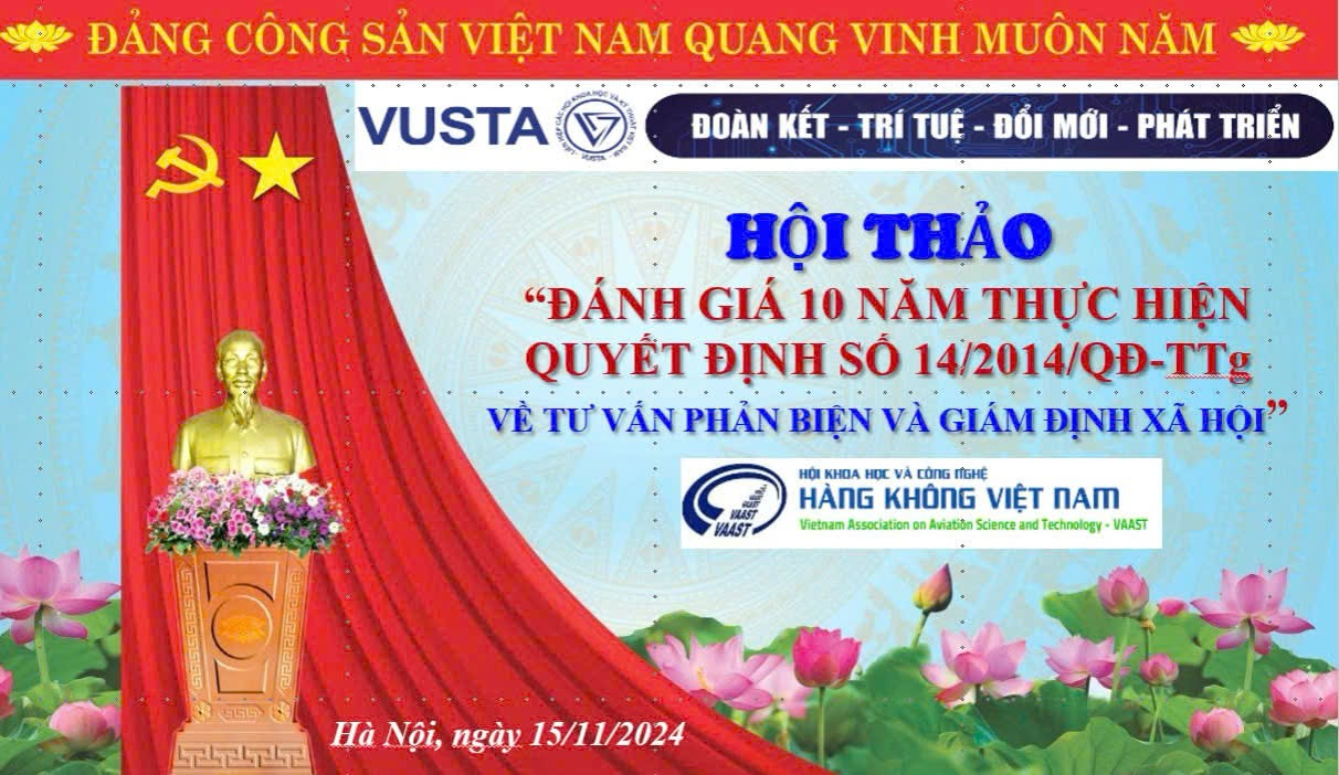 Hội thảo nhằm nâng cao chất lượng hoạt động Tư vấn, phản biện và Giám định xã hội, cũng như thúc đẩy công tác phối hợp của các Hội thành viên trong hệ thống Liên hiệp các Hội Khoa học và Kỹ thuật Việt Nam. Hội Khoa học và Công nghệ Hàng không Việt Nam (VAAST) tham dự và có Báo cáo tham luận với chủ đề: “Nâng cao chất lượng hoạt động tư vấn, phản biện và giám định xã hội tại các Hội ngành toàn quốc trong tình hình mới”.