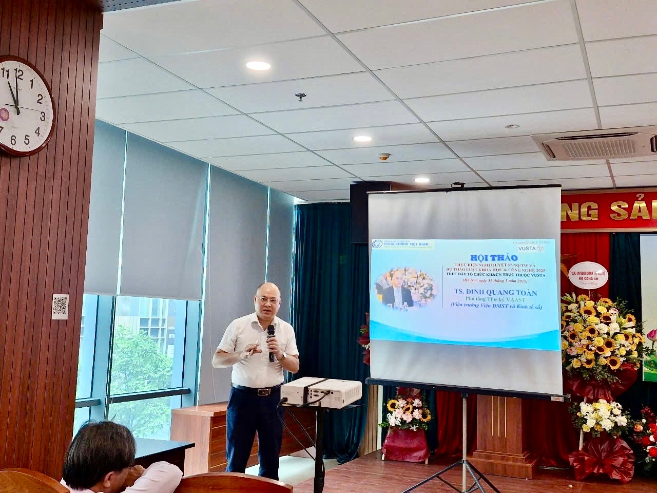 TS. Đinh Quang Toàn - Phó tổng Thư ký VAAST, kiêm Viện trưởng Viện Đổi mới sáng tạo và Kinh tế số (IIDE), Trường Đại học Công nghệ GTVT (Bộ Xây dựng), tham luận “Đổi mới công tác quản lý, nâng cao chất lượng và hiệu quả hoạt động của các tổ chức khoa học ngoài công lập - Giải pháp từ góc nhìn của Hội chuyên ngành thuộc VUSTA”