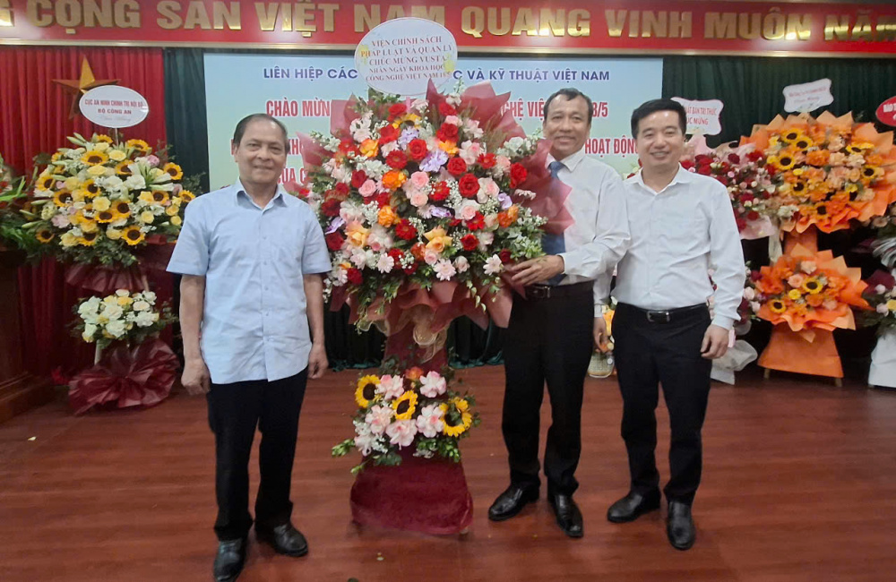 Phó Viện trưởng Viện Chính sách Pháp luật và Quản lý Đặng Đình Chấn (bên trái) tặng hoa chúc mừng Liên hiệp Hội Việt Nam (VUSTA)